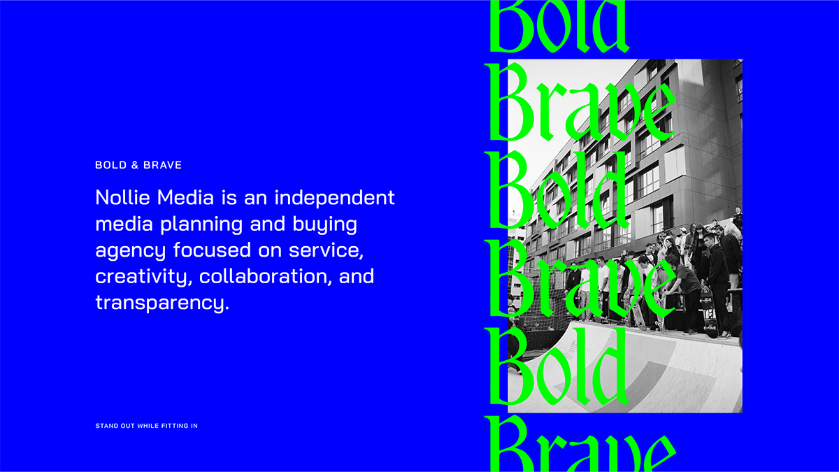 Nollie Media is an independent media planning and buying agency focused on creativity, collaboration, and transparency. I worked with Nollie to develop a brand strategy, visual identity and scalable design system that embodies their energetic, counter-culture spirit.